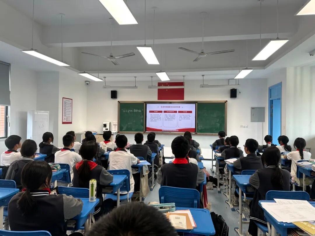 系列活动中,学校还特别邀请了嘉定区司法局督察科孙涵笑老师来我校以《致青春的第一份法治邀请函》为题为全体师生及部分家长代表作了法治专题讲座。讲座中,她介绍了我国全过程人民民主和基层法治观察活动的开展与作用,并结合刑事责任年龄下调、校园霸凌、网络言论规范、手机管理、电动车骑行等现实问题,普及法律常识,引导学生树立法治意识,提升理性表达与合法参与的能力。此次讲座不仅是面向师生的法治课堂,也是一次成功的家校共育活动,促进了教师、学生、家长对法治精神的共同学习与理解,为构建学校、家庭、社会“三位一体”的青少年法治教育格局奠定了坚实基础。