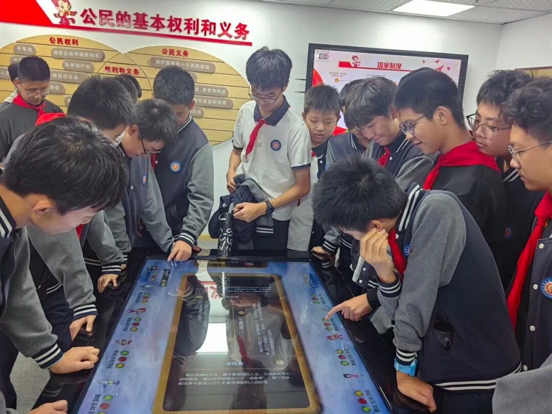 学校组织八年级学生走进上海市浏河营地法治教育馆,开展法治研学活动。在讲解员的引导下,同学们依次参观了法律知识学习展馆、反邪教馆、禁毒展馆等展厅,通过观看实物陈列、图文展板、多媒体演示和参与互动体验项目,直观感受了法治的力量与威严。这种沉浸式、体验式的学习方式,打破了传统课堂的界限,使抽象的法律条文变得生动具体,同学们在沉浸式体验中拓宽了安全知识面,提升了风险防范能力,加深了对法治的理解和信仰,极大地增强了法治教育的吸引力和实效性。