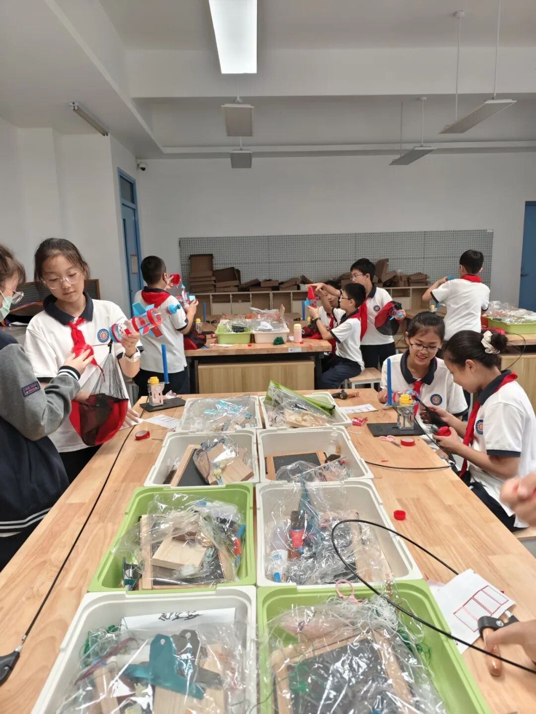 作为最受学生欢迎的项目之一,水火箭制作与发射活动让学生们兴奋不已。在制作阶段,六年级的同学们利用可乐瓶、怡宝瓶等材料,在老师的指导下精心制作了水火箭。在发射阶段,三个年级的学生分批次在操场进行发射体验。当一支支水火箭在打气加压后腾空而起,操场上爆发出阵阵欢呼。同学们通过亲身实践,不仅了解了作用力与反作用力的物理原理,更在动手操作中培养了科学探究的精神。这个活动让抽象的物理知识变得生动有趣,成为许多同学心中最酷的科技节记忆。 化学实验:紫甘蓝中的色彩魔法