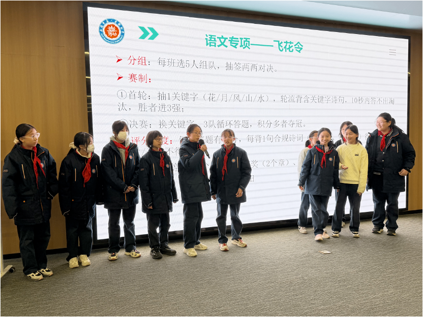 “风”“花”“雪”“月”,一个个温润的意象字,串联起六年级学子日积月累的经典诗词积累。各小组依次接力角逐,小组代表昂首挺胸、从容诵诗,语气坚定、底气十足;同组组员默默支撑、轻声鼓劲,默契相伴、同心同行。一句句经典诗词脱口而出,一缕缕诗意浸润全场,尽显中华经典的魅力与少年们的儒雅风采。达标获胜的小组当场斩获敲章奖励,用实力诠释了“腹有诗书气自华”的少年模样。
